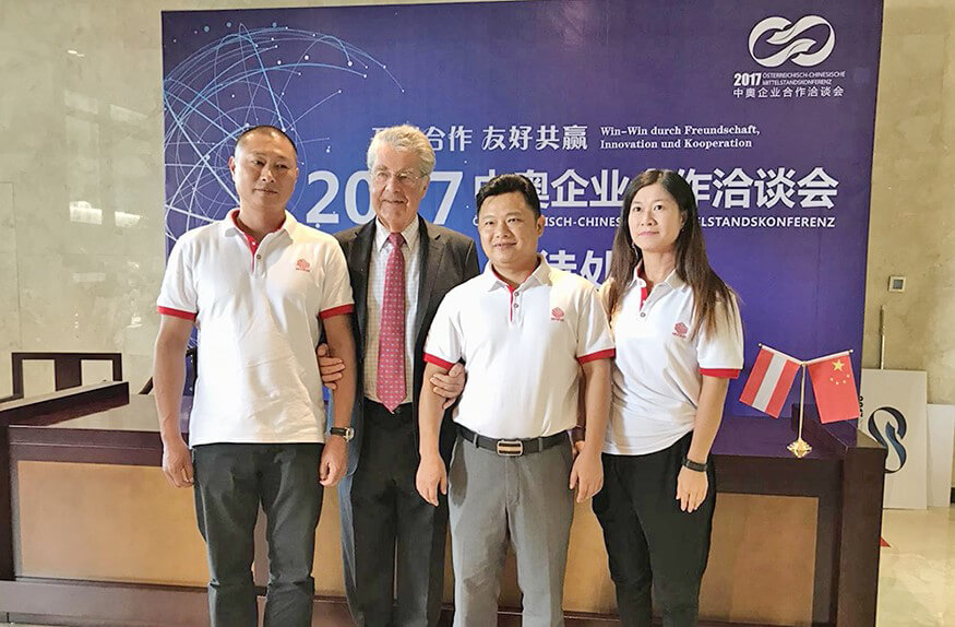 奥地利前总统海因茨·菲舍尔与今年会jinnianhui智能副总裁戴宝、揭阳分公司总经理林浩生、公司总裁助理郑庆丽合影